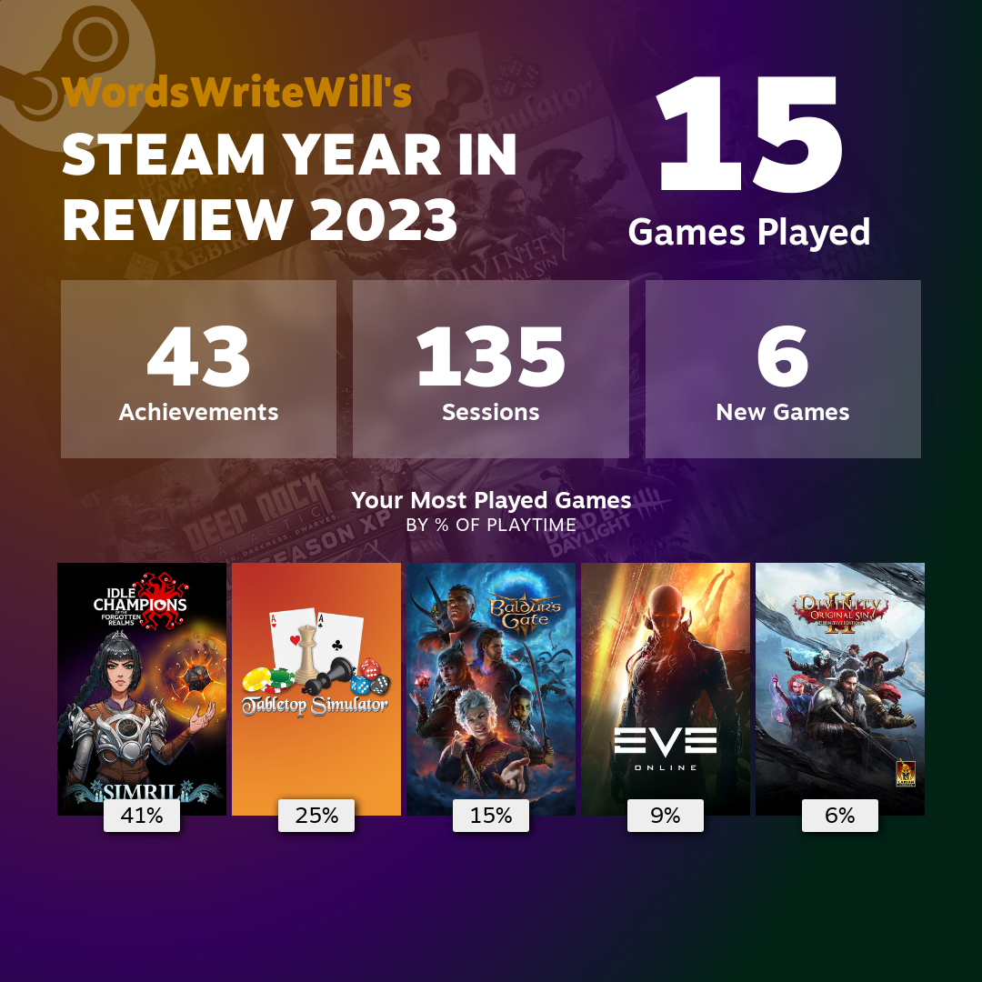 A mostly neutral year with some surprises, including new obsessions of the One Piece Card Game and Disney’s Lorcana in the tabletop place. I also reunited with my love Alan Wake which I finished just a few days ago and would’ve been my Game of the Year if not for Baldur’s Gate 3 which I’m sure is no surprise. I survived my first COVID infection in March, and had a brown Christmas in Minnesota. I played 8 games of Spirit Island over a weekend with a good friend, and spent a week on an Alaskan cruise. Overall, I’m fine with saying goodbye to 2023.